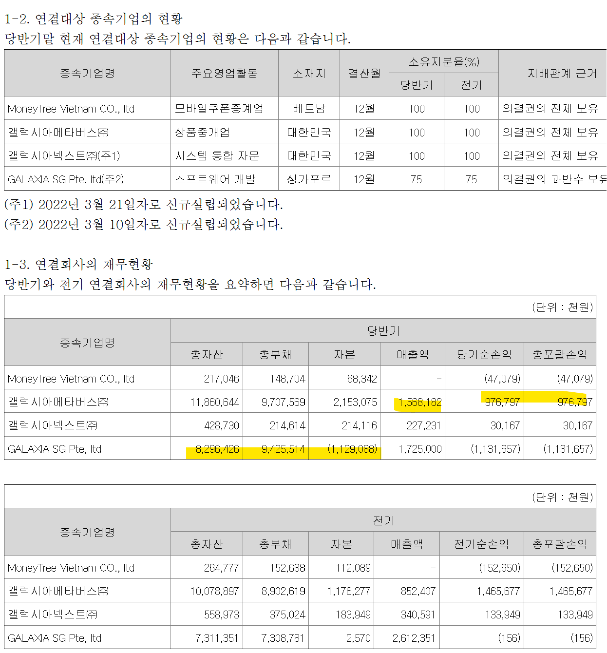 연결대상 종속기업의 표를 보면 대부분 재무상태가 좋질 않습니다.
