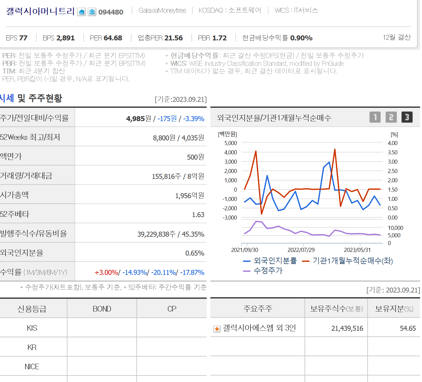 유동주식수는45%대 이며, 기관은 거의 없다시피하고 외국인 주식보유율은 하락세입니다.
